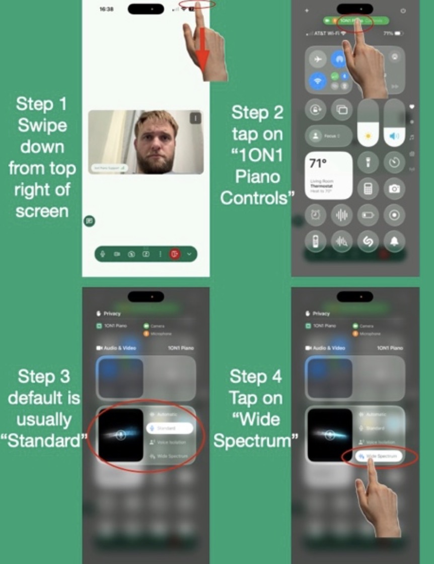 • iOS: For best audio on iOS, switch the microphone mode to “Wide Spectrum” (see graphic instruction).